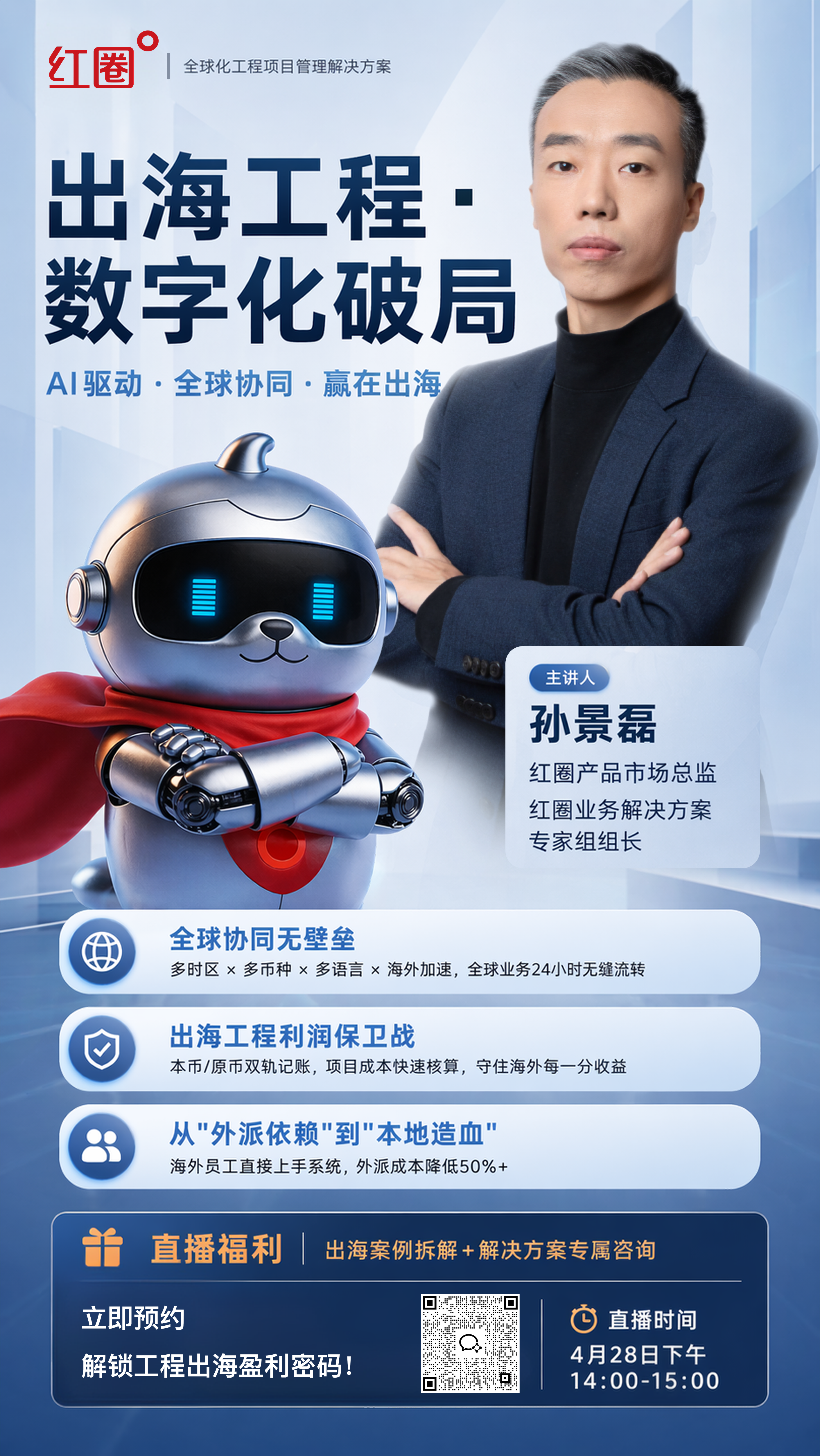 4月28日14:00,红圈产品市场总监、业务解决方案专家组组长 孙景磊 将带来一场干货直播——《出海工程·数字化破局》。