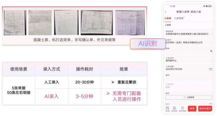 红圈AI录单助手就是来干这活的,靠大模型自动识别各种单据,从图像识别到录入系统,秒级闭环。甭管是混凝土票、机打送货单,还是手写的确认单,系统自动提取关键信息,匹配业务数据后回填。这一下就干掉90%的人工操作,也干掉了人工录入可能带来的所有错漏。入库材料自动跟合同明细挂上钩,每一分钱的成本从哪来的,查得清清楚楚,后期想统计实际成本、追溯源头,那是真方便。