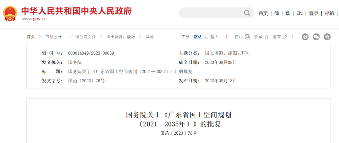《广东省国土空间规划(2021—2035年)》已经国务院批复同意。