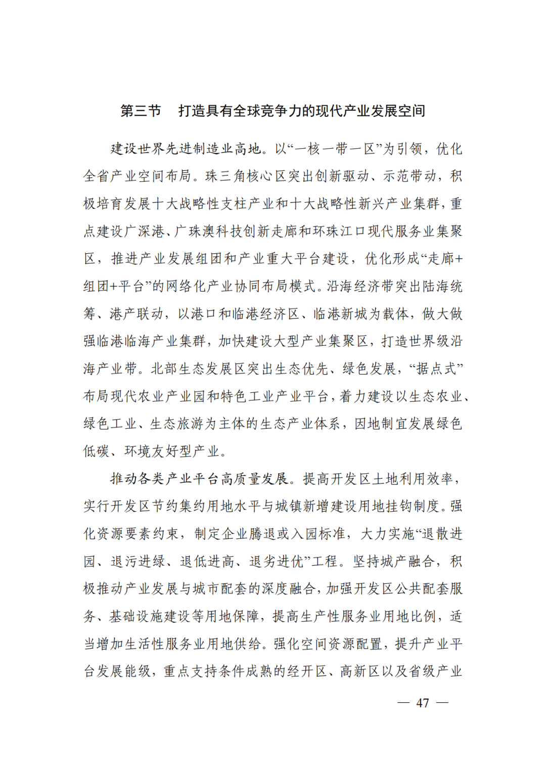 鼓励珠三角与东西两翼、北部生态发展区合作共建产业平台,重点支持韶关国家产业转型升级示范区、河源深河产业共建示范区、梅州梅兴华丰产业集聚带、云浮氢能和金属智造产业基地、汕尾陆丰沿海新型能源和装备制造产业带等平台建设。