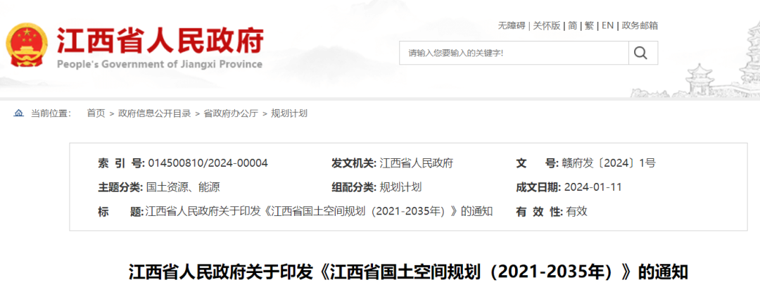 2024年1月11日,江西省人民政府正式印发《江西省国土空间规划(2021-2035年)》。