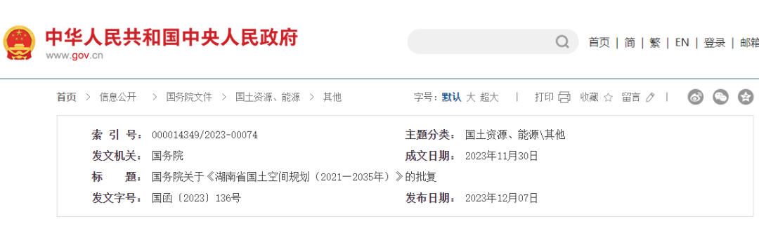国务院关于《湖南省国土空间规划
