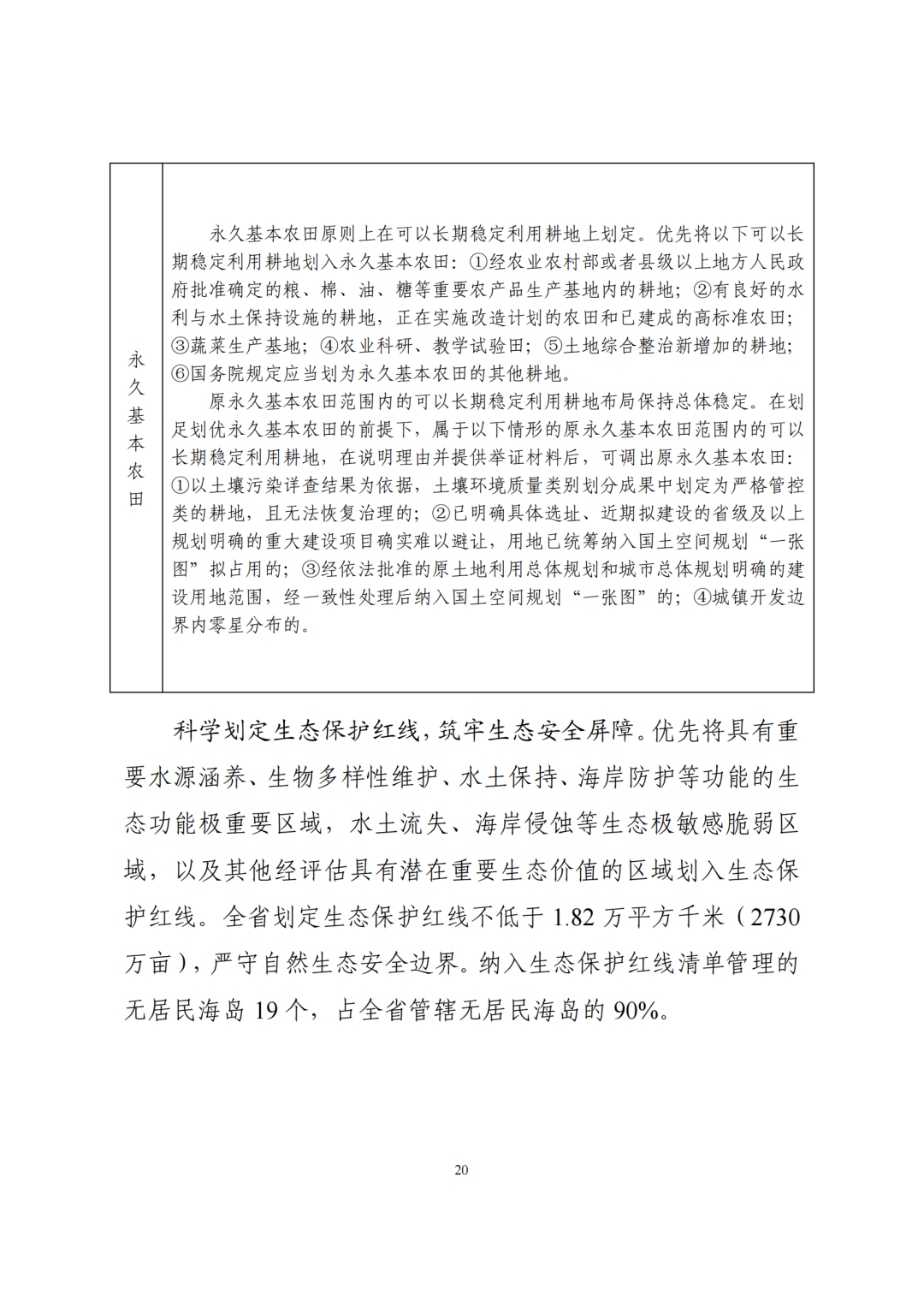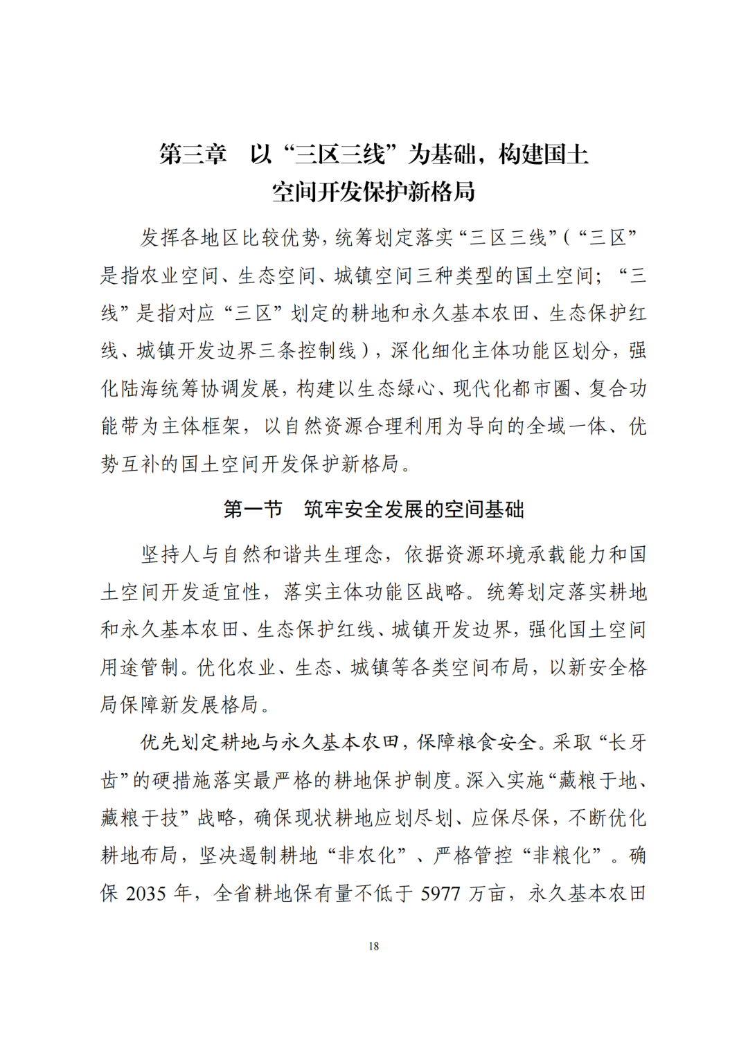 二、筑牢安全发展的空间基础。到2035年,福建省耕地保有量不低于1341.00万亩,其中永久基本农田保护面积不低于1215.00万亩;生态保护红线面积不低于4.34万平方千米,其中海洋生态保护红线不低于1.18万平方千米;城镇开发边界扩展倍数控制在基于2020年城镇建设用地规模的1.3倍以内;单位国内生产总值建设用地使用面积下降不少于40%;用水总量不超过国家下达指标,其中2025年不超过189.9亿立方米。明确自然灾害风险重点防控区域,划定洪涝等风险控制线,落实战略性矿产资源、历史文化保护等安全保障空间,全面锚固高质量发展的空间底线。