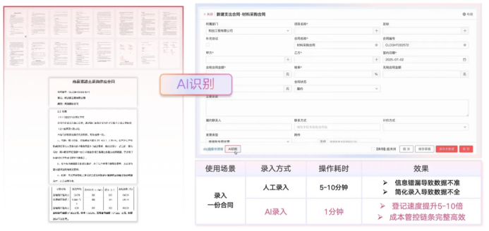 项目竣工阶段涉及合同收尾、结算管理与数据归档,是实现项目闭环的关键。红圈系统通过合同管理模块对合同履行、变更与结算过程进行跟踪,规范合同体系,规避履约风险。合同全生命周期管理功能支持动态实时监察,确保合同条款执行到位,并及时处理争议与变更事项。同时,红圈AI系列智能产品中的AI录单助手能够自动识别合同关键条款,准确提取付款比例、付款条件、价税金额等信息,为后续履约执行提供重要参照。