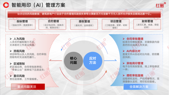 总结而言,红圈智能印控一体化解决方案,通过 “AI核验+数字流程+智能硬件+全场景覆盖” 四位一体的系统性创新,真正完成了企业用印管理从被动“人防”到主动“技防”的战略性跨越。它不仅以前沿技术筑牢了企业用印安全的智能防线,更通过深刻的流程再造与效率革命,推动了企业整体运营管理的提质增效,为企业在数字化时代的稳健发展保驾护航。