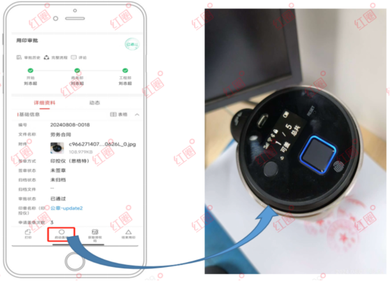 为解决上述痛点,红圈构建了“AI智能核验、全流程数字化、智能硬件保障、全场景覆盖”四位一体的全方位用印风控体系。
