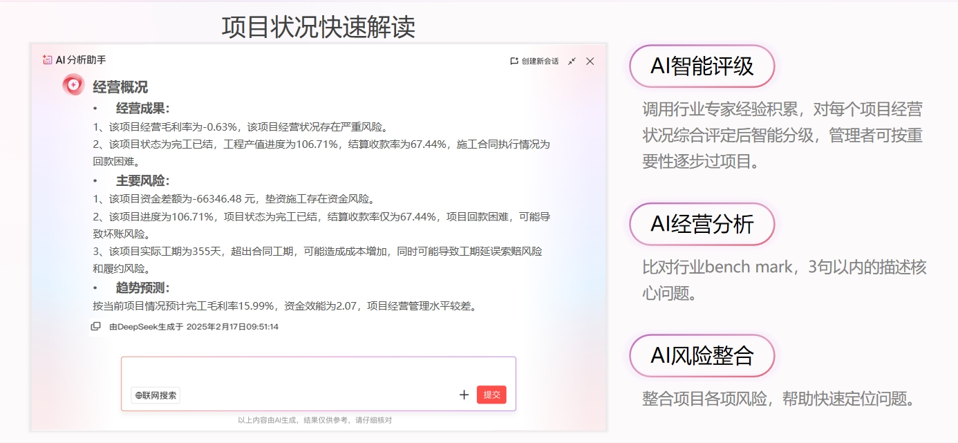 红圈推出的红圈AI系列产品中的项目360°AI解读,能把项目上的资金、成本、合同、付款这些数据全都整合在一起,一键生成一张项目全景作战图。