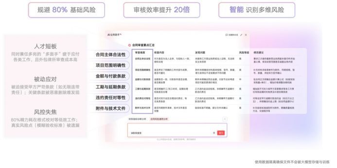 有了这“全景图”,红圈AI报表助手如虎添翼。它像“部门的智能分析官”,拿到报表后,大模型自动定位异常指标、生成根因解读与改善建议,三句话把核心问题说清楚,整合各种风险。和其打配合的还有红圈AI业务助手,实时解析工程管理业务数据,自动生成风险预警及优化建议,帮助规避80%基础风险,审核效率提升20倍。