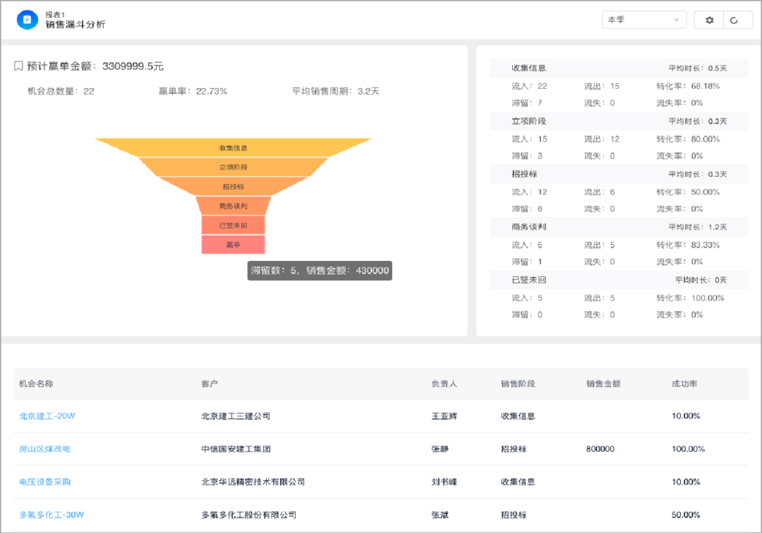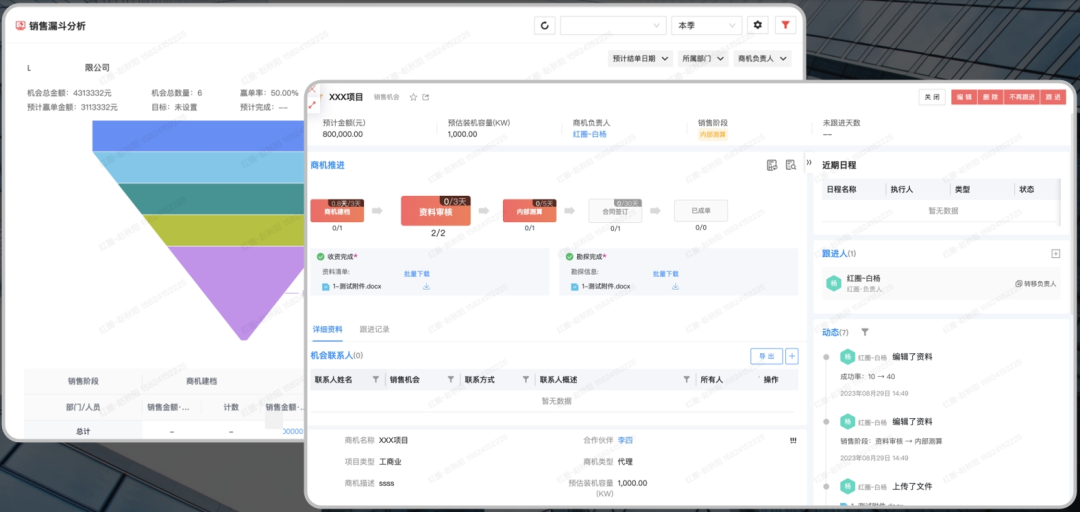 ○ 商机管理模块(项目迷雾一扫光): 为公司构建项目商机推进转化漏斗,清晰展示各阶段项目数量及分布,帮助管理层快速锁定需重点关注的商机,合理调配资源,加速项目转化。
