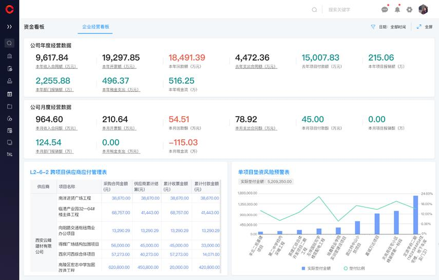 ○ 财务管理模块(资金风险防火墙): 财务实现合同-结算-收开票-收付款全链路数据串联。老板审批付款时,可清晰掌握公司、项目、供应商层级的应收、应付、垫资数据及公司资金余额,洞悉真实可支配资金。同时显示成本花费情况,审批时自动关联合同成本,预警成本超支风险。