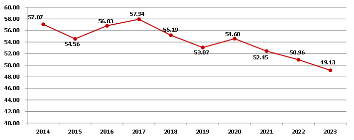 2023年,全国建筑业企业签订合同总额724731.07亿元,比上年增长2.78%,增速比上年降低4.56个百分点。其中,本年新签合同额356040.19亿元,比上年降低0.91%,增速比上年降低5.19个百分点(图10)。本年新签合同额占签订合同总额比例为49.13%,比上年下降了1.83个百分点,连续三年下降(图11)。