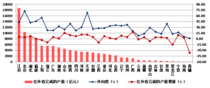 图18 2023年各地区跨省完成的建筑业总产值及外向度