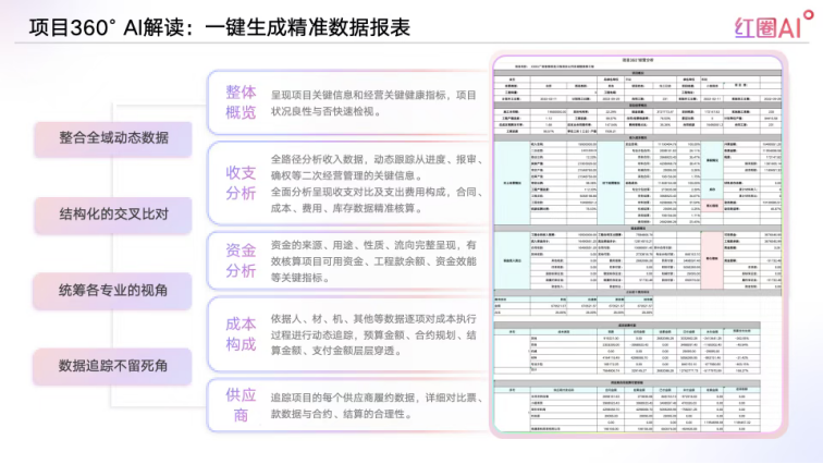 比如项目360°AI解读,你想了解某个项目的情况,不用再让下属写报告——点一下按钮,系统自动生成一份“效益体检报告”:资金够不够用?成本有没有超支?进度是不是滞后?甚至能告诉你“成本超支是因为某分包商频繁变更合同”,连优化建议都给出来。相当于给你配了个“智能参谋”,不用自己扒数据,问题根因、解决方向全清楚。