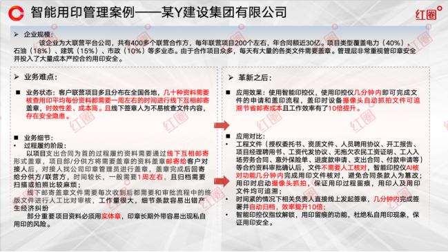 红圈智能印控一体化解决方案的应用,成功帮助企业实现了从依赖“人防”到依托“技防”的本质跨越,带来了效率与安全的双重提升。
