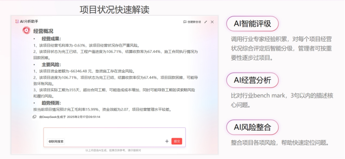 红圈推出的红圈AI系列产品中的项目360°AI解读,能把项目上的资金、成本、合同、付款这些数据全都整合在一起,一键生成一张项目全景作战图。